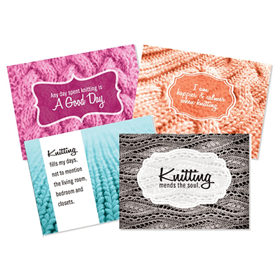 These new “Knotes” and “Crotes” note cards are perfect for you or the knitters and crocheters in your life. Each set comes with eight cards; two of each design shown. Blank inside. Envelopes included. Printed in the USA on 30% post-consumer waste card stock. 5 1/2″ x 4 1/4″ (14 x 11cm)