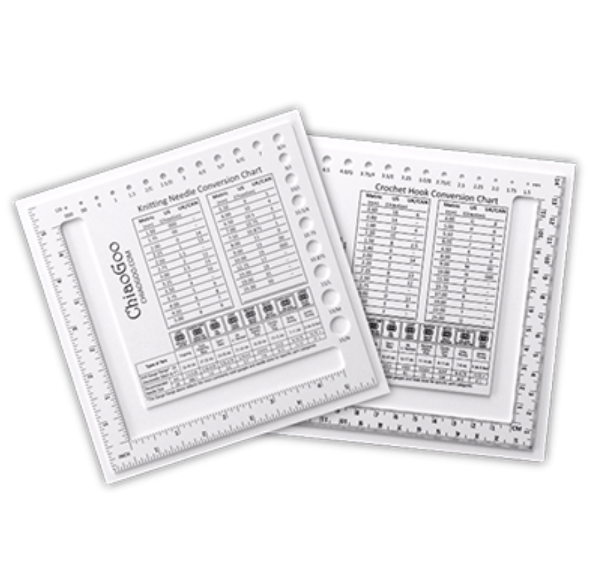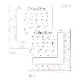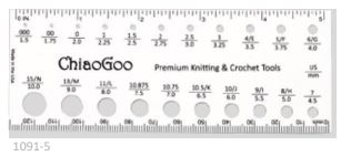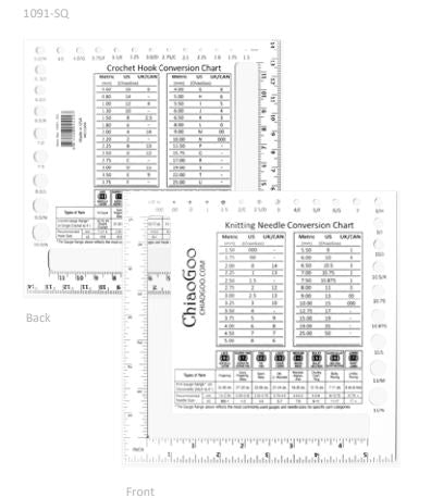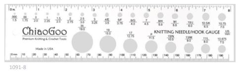 Double-sided US/metric, Swatch/Needle Gauge made in the USA! Available in 5.5″ (14 cm) Square and 3” (7.5 cm) Square. Needle Gauges available in 5" (13cm) and 8" (20cm).