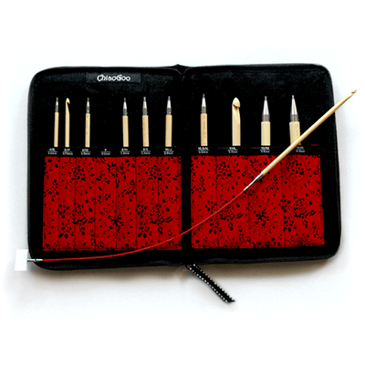 T-SPIN ChiaoGoo’s NEW bamboo Tunisian interchangeable set. This T-SPIN set will come with the following. 11 5.7″ (14.5cm) hooks in sizes E/4 (3.5mm), N/15 (10mm), including size 7 (4.5mm), four TWIST [S] red cables (two 8″/20cm, one 14″/35cm and one 22″/55cm), four end stoppers, four adapters, two connectors, tightening keys and a needle gauge. Zippered case very similar in design to our current interchangeable cases with 11 labeled, inside pockets and one outside zippered pocket. Hooks are made of Moso bamboo with a stainless steel join. Pointy head to get into your stitches. Size permanently laser marked on each hook. No drag, smooth transitions and secure connections. Size I (5.5 mm) and larger hooks will fit the [S] cables with the use of an adapter (included). Compatible with SPIN cables From the product master file.