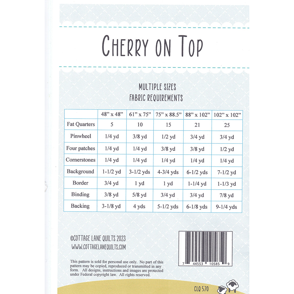 The Cherry on Top Quilt Pattern, designed by Cheran Bee, is a delightful addition to any quilter's collection. The pattern is easy to follow and includes detailed instructions for creating this beautiful quilt. With its bright and cheerful colors, the Cherry on Top Quilt is sure to brighten up your space and bring a smile to your face. So why not add this charming pattern to your collection today?